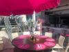 Características: Cinco mesas redonda em madeira e com pé em metal
