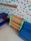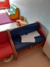 mesa oval em madeira 1,25; armário disfarces madeira c/espelho 1,25 altura; móvel madeira c/4 portas 1,20×0,90 de cor verde; móvel madeira c/2 portas 0,80×0,60 de cor rosa; mesa redonda de madeira 0,80 de cor verde; móvel de apoio (3 divisões) em madeira de cor verde; sofá madeira 0,40×0,40; sofá madeira 0,80×0,40; mesa madeira oval 1,20; móvel apoio madeira (3 divisões) 1,40×1,20; 4 cadeiras madeira para criança 0,30×0,30; biblioteca c/3 divisões em madeira 0,80×0,60; mesa rectangular plastico azul 1,00×0,70; móvel apoio madeira (3 divisões) 1,40×1,20; móvel apoio madeira (6 prateleiras) 0,90×0,90; mesa retangular em madeira 1,40×1,00; biblioteca c/3 divisões em madeira 1,00×0,80; mesa plástico azul com 2 bancos acoplados